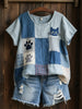 Damskjorta i linne med söt kattmönstrad patchworkkonst